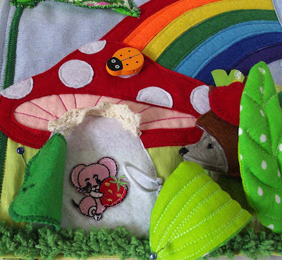 Этот разворот, это не просто кусочек ткани, это волшебный мир, который подарит ребенку много интересных и увлекательных минут игры! Здесь у нас живет добрый Еж! Он собирает яблоки и груши, гуляет по радуге и ходит в гости к мышке!. Здесь у нас ярко светит солнце, а иногда прилетает тучка и идет веревочный дождик. Здесь по канату-шнурку можно забраться на дерево и собрать цветы-пуговицы! Здесь бывает день, и бывает ночь. И ночью из-за тучки выходит месяц. А когда пригревает солнышко, то прячущаяся в листиках божья коровка прилетает погреться и садится на чудо-гриб:)